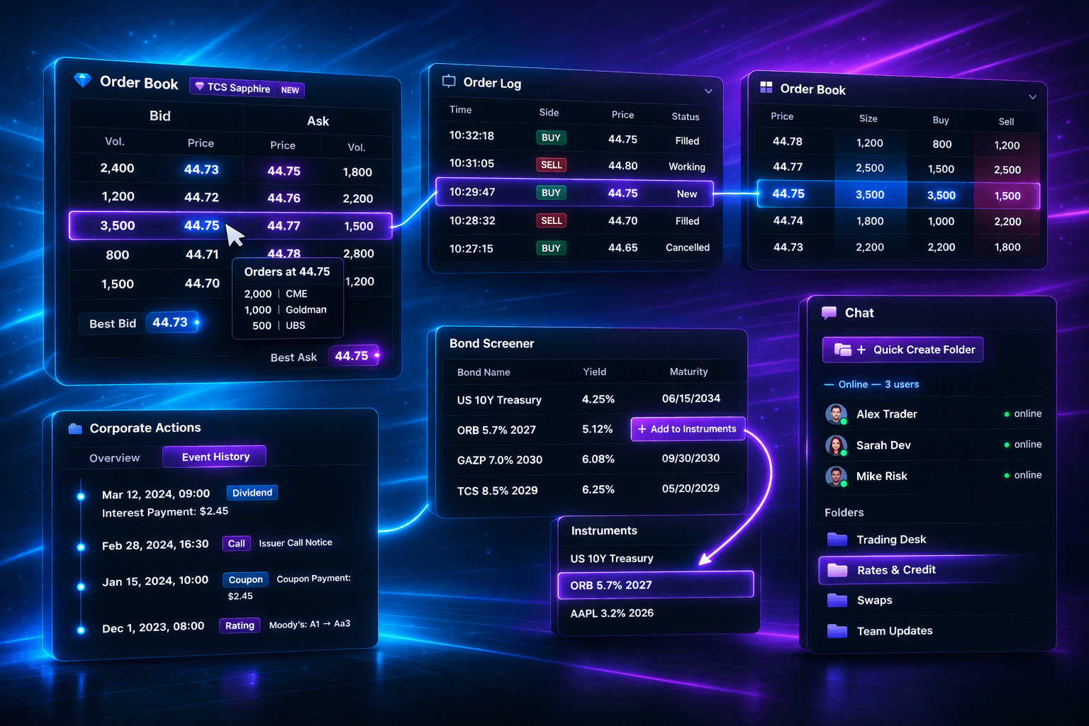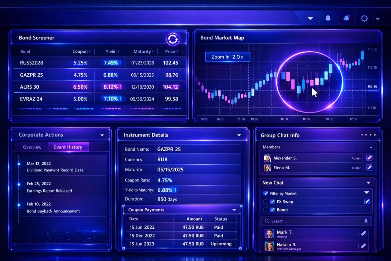 - Переход из события в детали инструмента и карточку эмитента.